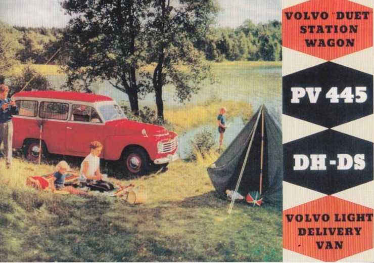 Tälta på svenska med Volvo Duett, här i den internationella reklambroschyren.