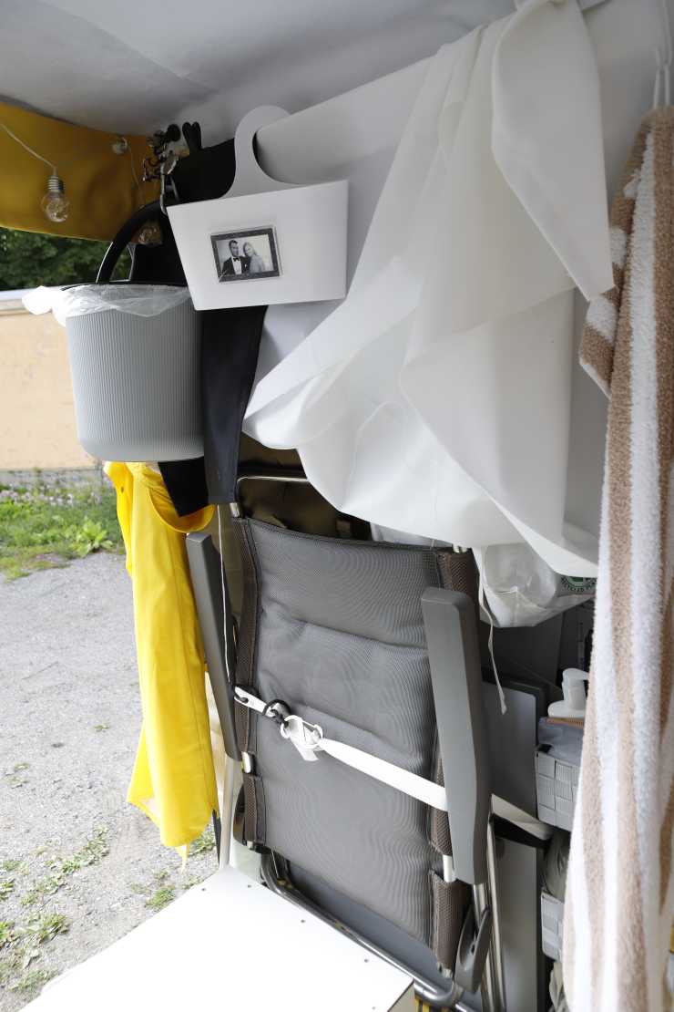 Till slut hittade hon en Iveco Daily och sedan kunde arbetet börja. Allt var krångligare än det är för en frisk person, redan före själva byggfasen. Alla material testades först hemma i lägenheten: Luktade det eller inte? Trä gick nästan helt bort. Metall, glas, tyg och plasterna polyethylen och polypropyen fick godkänt.