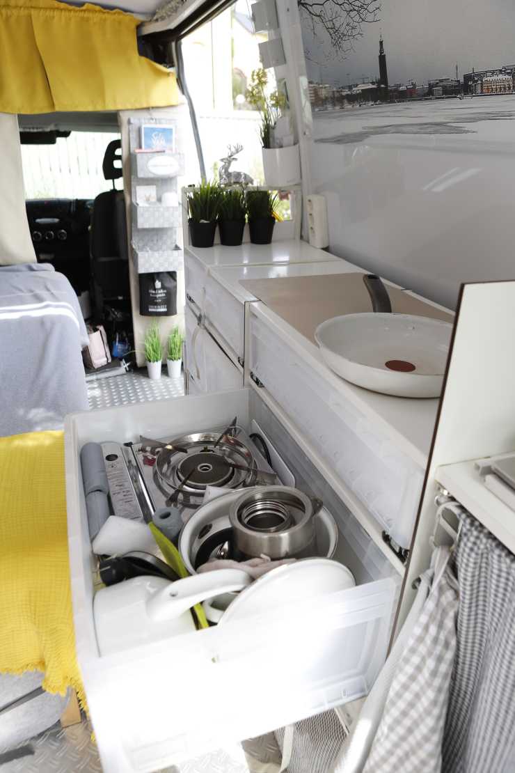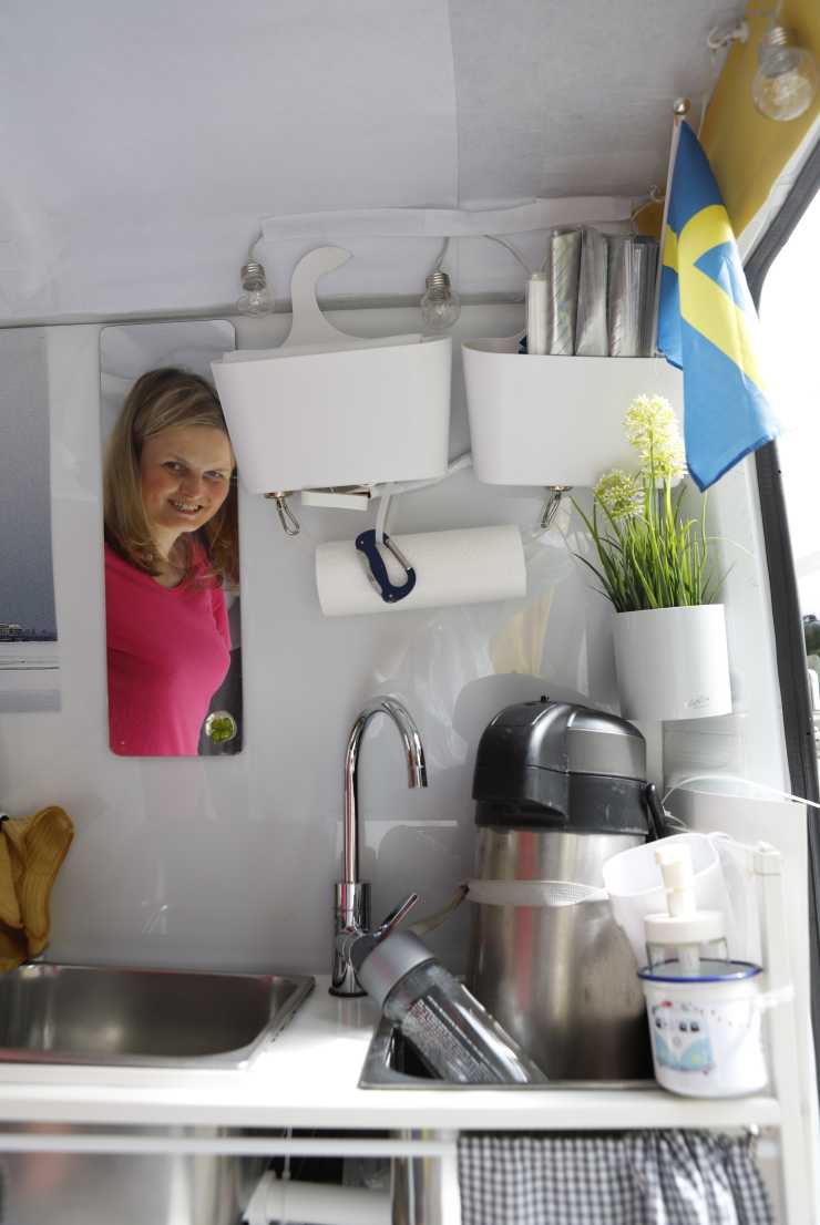 Sakta växte hennes plåtis fram, full med smarta lösningar och kemikaliefria material. En Ikeahylla i metall blev köksbänk, förpackningsplast skars i små bitar så den kunde användas för att minska klirrande och sängens kuddar fylldes med kläder – för att spara utrymme. Efter två år, 2021, var den tillräckligt färdig och hon kunde resa. Till Sverige förstås. Hon fricampade för det mesta och mådde bättre än någonsin.