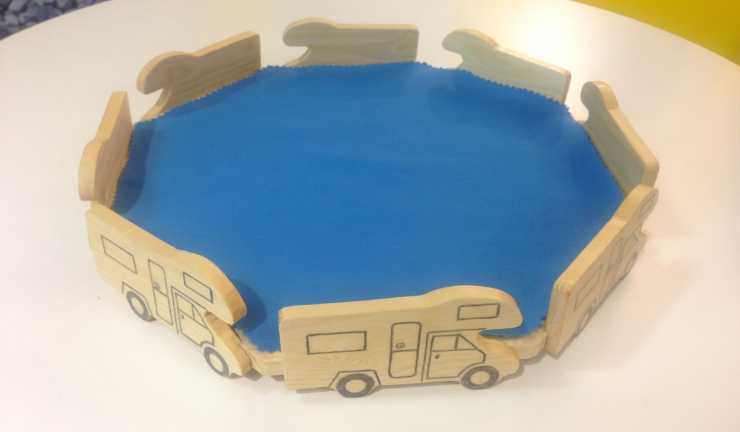 När du är klar med allt detta limmas husbilarna på bottenplattan med trälim. Tänk på att limma snyggt så att inte limmet spritsar ut och att bilarna står rakt och inte lutar inåt. Låt det torka och efter det återstår endast att lacka brickan. Lättast är att använda lack på sprayburk vilket du hittar på många ställen.