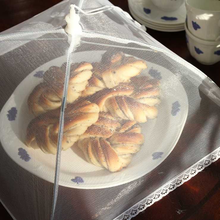Kommer flugor och getingar lagom till måltiden? Ett genomskinligt nätparaply håller ovälkomna flygfän borta från maten.
