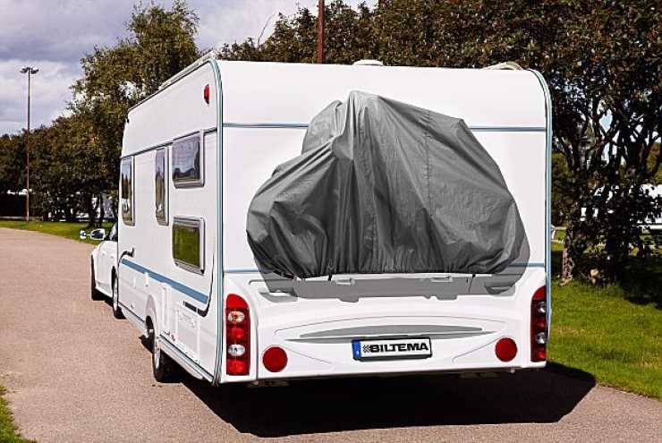 Lättviktsöverdrag för skydd av 2 eller 3 cyklar. Med hållare för varningsskylt. Levereras med flexibla fästkrokar för enkel fastsättning. Ej lämplig som skyddsöverdrag för cyklar som sticker upp över fordonets tak.