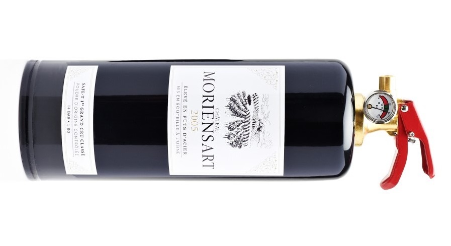 Den vinflaskeliknande brandsläckaren tillverkas i Belgien, väger 2 kg och håller europeisk brandsläckarstandard. Höjd 29 cm x diameter 9 cm. Finns i flera färger och mönster. Levereras med ett väggfäste.