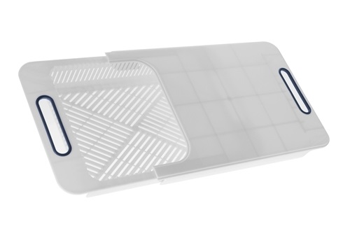 Egentligen finns det inte såmycket att tillägga om denna skärbräda i plast förutom att den är dubbel med en inre och yttre del. Skjut ihop eller dra ut beroende på hons storlek och vätskorna rinner rakt ner i diskhon genom den peforerade inre delen. Justerbar i längd, från 43 cm till 62 cm.