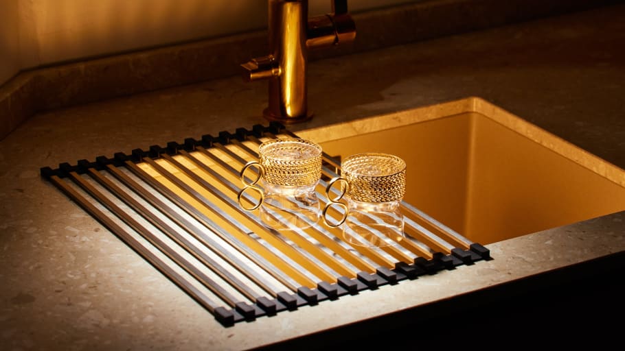 En hoprullbar torkställning gör att du kan utnyttja ytan över diskhon och få en smart avställningsyta att ställa disk, kastruller och livsmedel på. När du inte använder ställningen är det bara att rulla ihop och förvara i kökslådan.