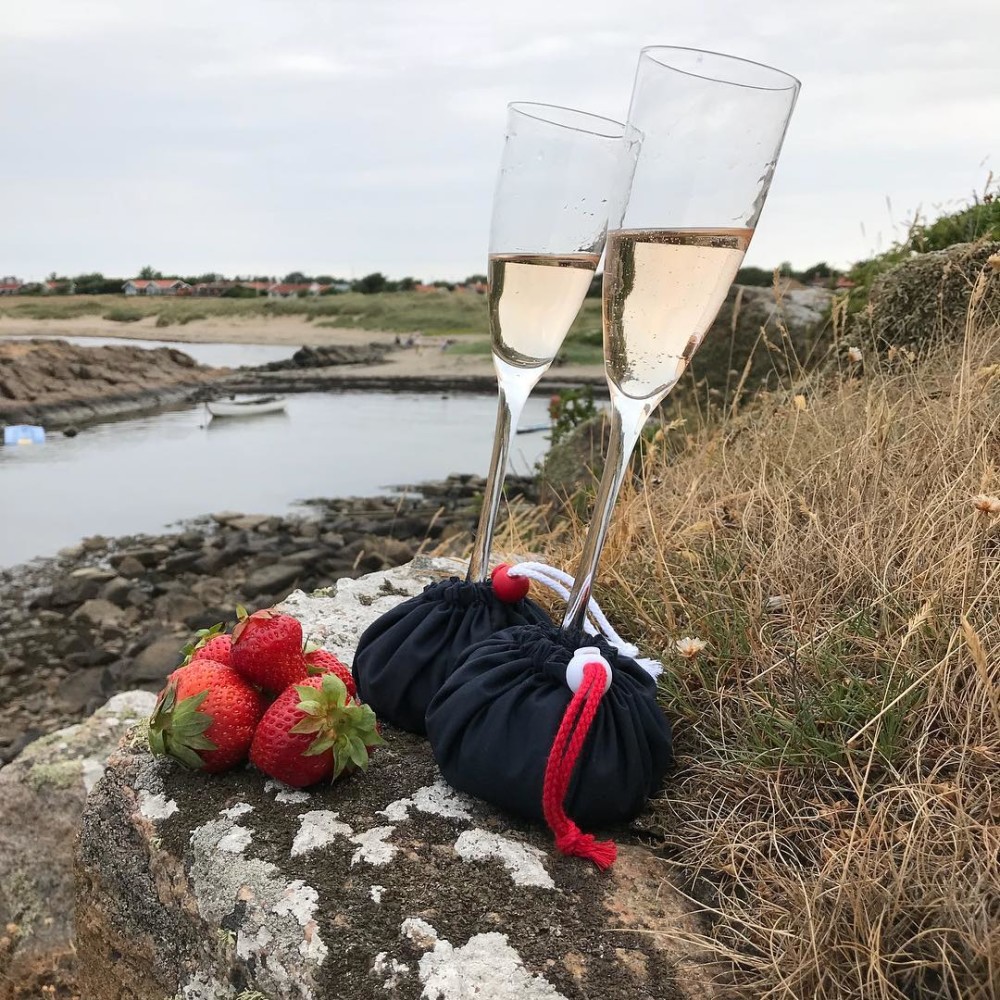 De små sandpåsarna är lätta att ta med och går snabbt att sätta runt glaset. Påsarna är sydda med dubbelt tyg och fyllda med sand. Dragskon ser till att vinglaset står stadigt i påsen och sanden anpassar sig efter underlaget och ger vinglaset en stabil grund att stå på. Innovationen säljs i en förpackning med 2 st vinglashållare och finns i flera färger.