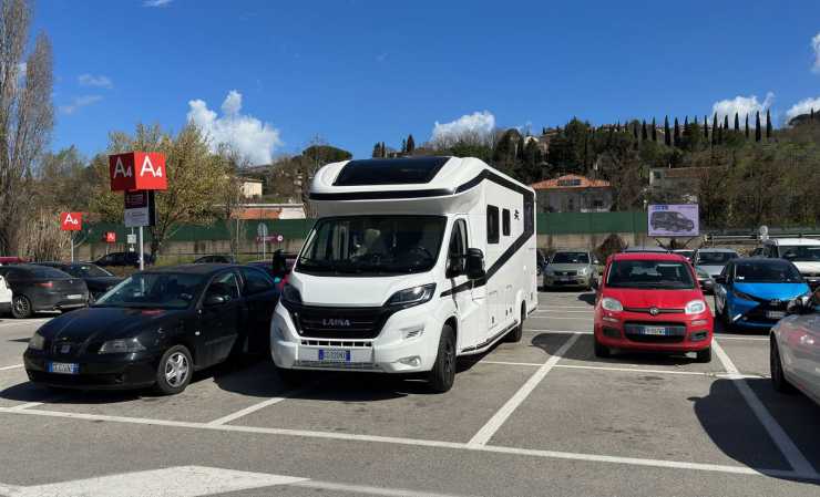 Klockan 11 står vi fortfarande och väntar och börjar få slut på samtalsämnen. När den äntligen dyker upp visar det sig att Andrea som ska göra genomgången av funktionerna bara pratar italienska och min skolitalienska från 1980-talet är inte så stark på husbilstermer. Det är inte Robertos engelska heller, så det blir några förvirrade ögonblick innan vi kan köra i väg.