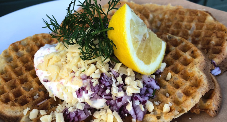 Västerbottenvåffla toppad med kantareller, picklad rödlök, persilja och Västerbottenost är en favorit på Eljest i Umeå.