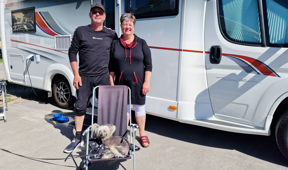 Bosse Johansson och Inge-Marie Linder med sin värmeälskande hund Peppe, på Söderhamns Citycamping.