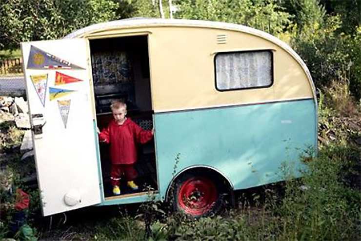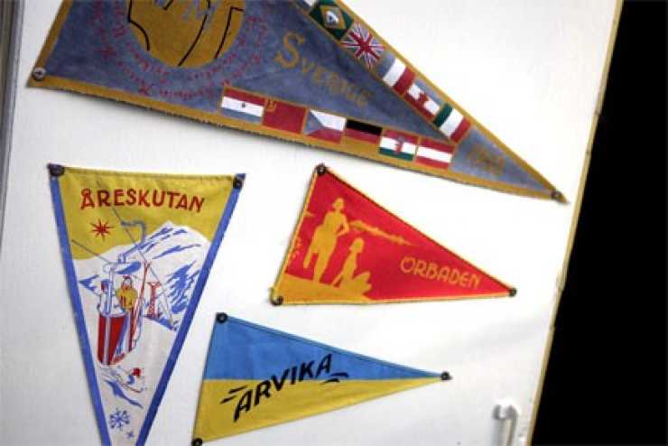 Om jag börjar med häftstiften, så kanske ni fattar. Kanske. Efter flera års sökande hade jag äntligen fått fatt i rätt sorts turistvimplar till vår husvagn, att fästa på dörrens insida. Rätt sorts. Inte bara Säffle rakt upp och ner utan Åreskutan med den rätta femtiotalsknycken. Det kan vara typsnittet eller bilden det kommer an på; en torftighet, en överdrift. Ett koncentrat av det där lite småtrista svenska femtiotal som samtidigt glimmar lite matt. Sådana vimplar var det. Så då stod jag med Orbaden, Arvika och Omberg, färdiga för montage på familjens Wuco 1950, vår älskade husvagn som troget släpat oss i hälarna i mer än 15 år nu. Men det var fel häftstift.