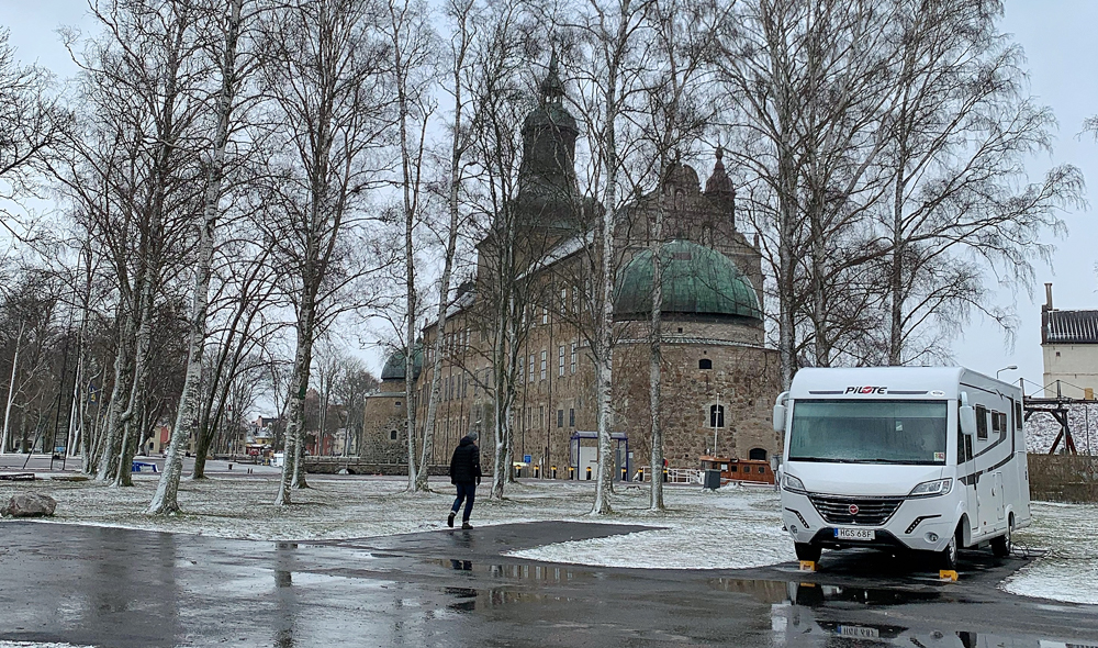 Ställplatsen centralt i Vadstena levererar – även när det är snökaos i april.