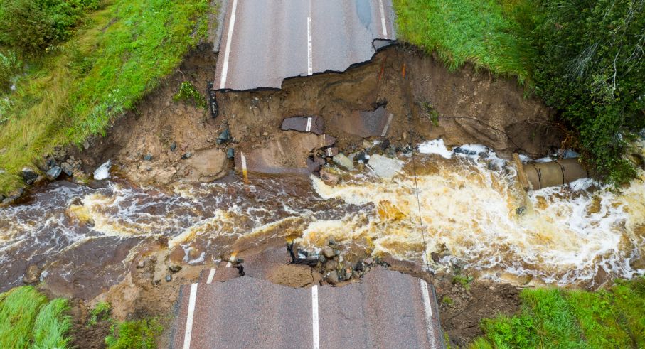 Skyfallet över Gävleborg och Dalarna lade delar av Gävle under vatten och spolade bort flera vägar, bland annat utanför Borlänge, nära Romme.