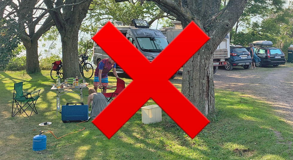 Det gäller att tänka ett varv till innan man breder ut sig, packar upp grill och möbler på en stor yta, som paret från plåtisen i bakgrunden gör på bilden. På den här oskyltade parkeringsplatsen används även gräsytan för parkering under sommaren.