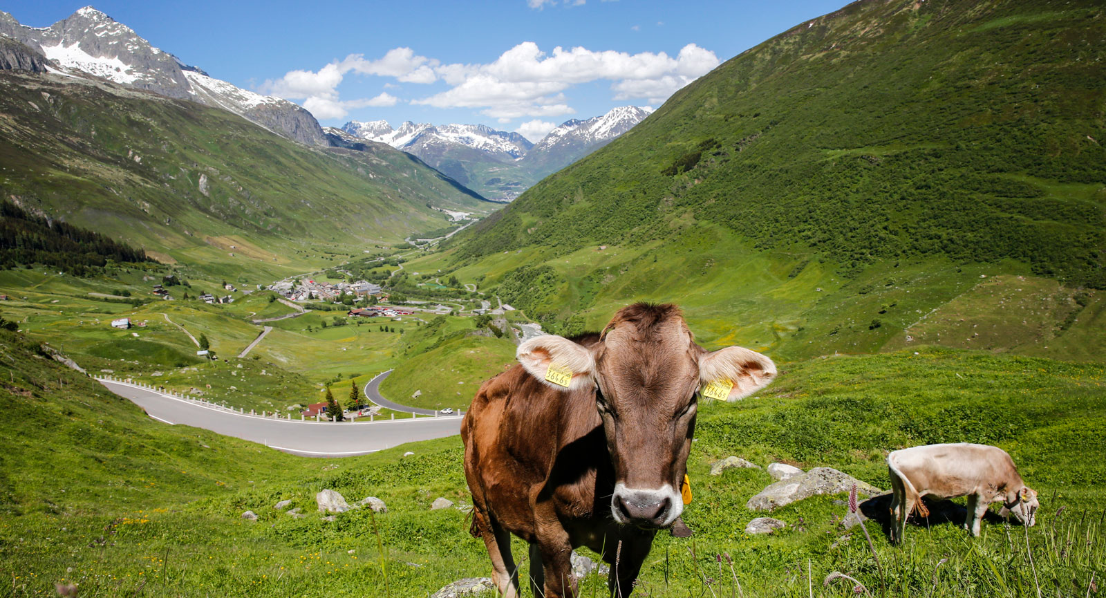 Nyfikna kossor betar i alplandskapet där Sean Connery drog fram i Goldfingerfilmen från 1964.