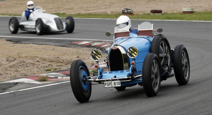 En klassiskt blå Bugatti tar en sväng på den skånska racingbanan RIng Knutstorp.