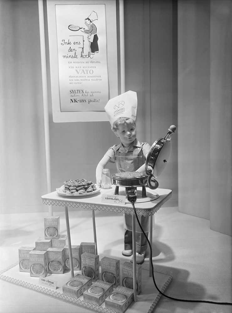 NK:s skyltfönster, 1950. En liten pojkskyltdocka, i kockmössa med NK Livs logotyp och kockkläder, lagar våfflor. På ett anslag på väggen bakom honom står det: ”Inte ens den minste kock kan misslyckas med våfflorna när man använder VATO färdigblandade ingredienser som bara behöver tillsättas med vatten! SYLTEN har mamma redan köpt på NK-livs förstås!" Foto: Nordiska Kompaniet, ©Nordiska museet