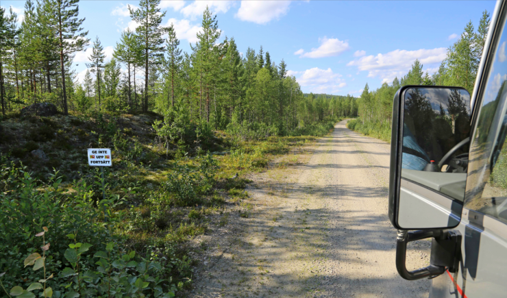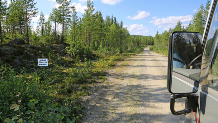 Skylten "Ge inte upp - fortsätt" möter oss på väg mot en av Sveriges ensligast belägna campingar, Norsträsk i Västerbotten. Vi gav inte upp och det är vi glada för i dag!