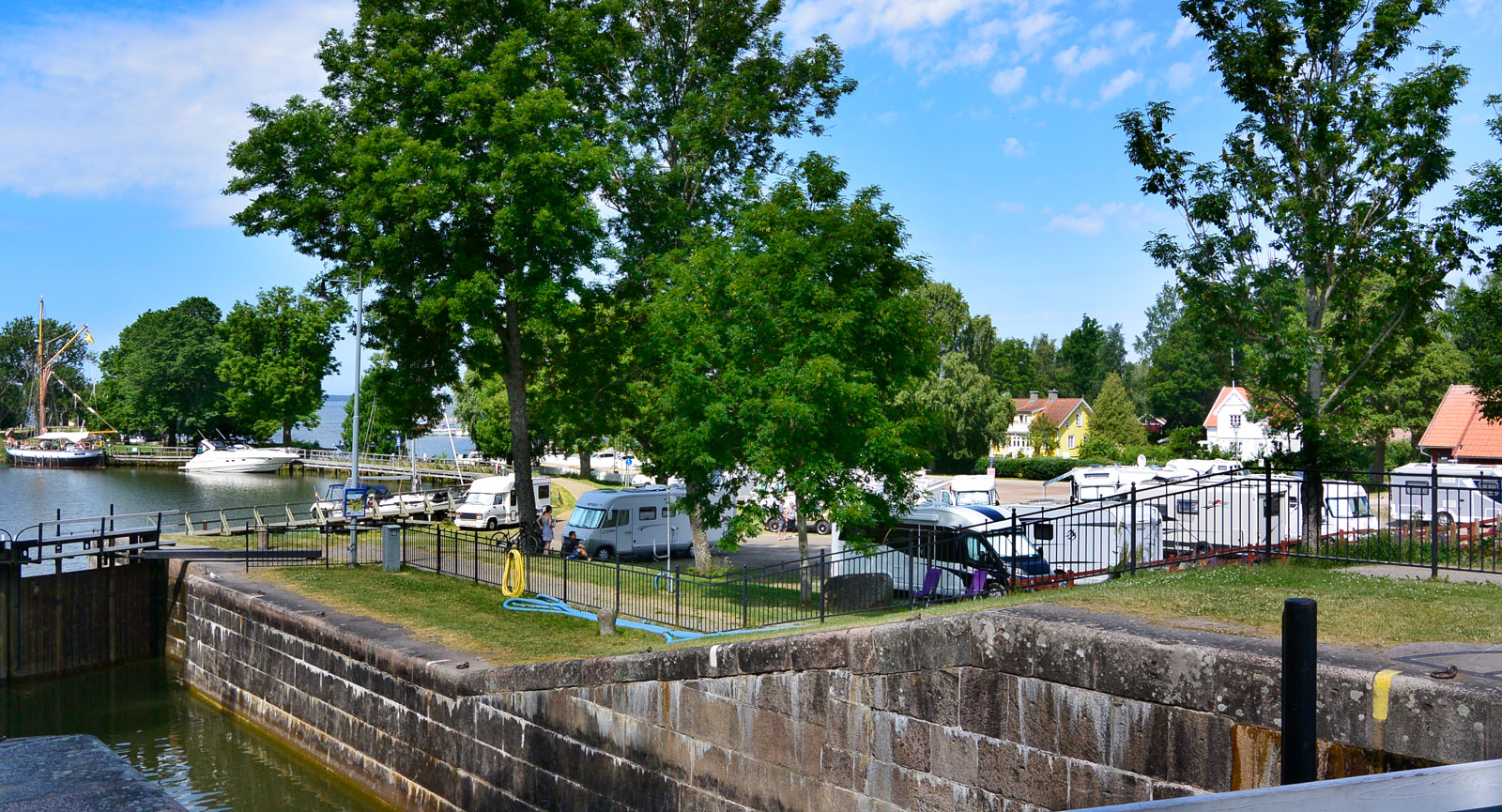 Väl framme i Forsvik unnar vi oss en glass medan vi tillsammans med många andra fascineras av båtarna som slussas, via kanalens äldsta sluss med Sveriges äldsta järnbro, båda invigda 1813. Här i Forsvik står husbilarna uppställda på första parkett, precis där kanalen mynnar ut i Bottensjön som vi sedermera tar oss igenom. Lagom till kvällen når vi fram till Karlsborg där vi tältar på en pir vid Vätterns västra strand. Det är nu tillfälligt slut med lugnet i den grävda delen av kanalen. Härnäst ska vi korsa Vättern – en utmaning så god som någon.