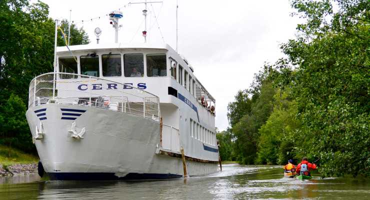 En liten pojke med en glasstrut i handen pekar i vår riktning och bekräftar att vi nog är lite udda fåglar i den här kontexten. Efter att ha passerat ytterligare en skock storögda åskådare och Söderköpings sista sluss, sjösätter vi kajakerna en sista gång. En dryg timme senare lägger jag handen på den solvarma kanalkanten i Mem, precis nedanför Kanalmagasinets mysiga uteservering. Bortom Göta kanals sista sluss kan jag se några husbilar som står och blänker i solskenet, med Östersjöns glittrande vatten i bakgrunden.