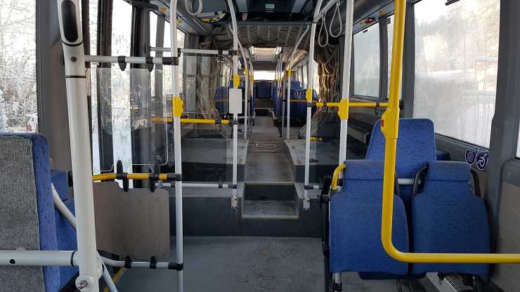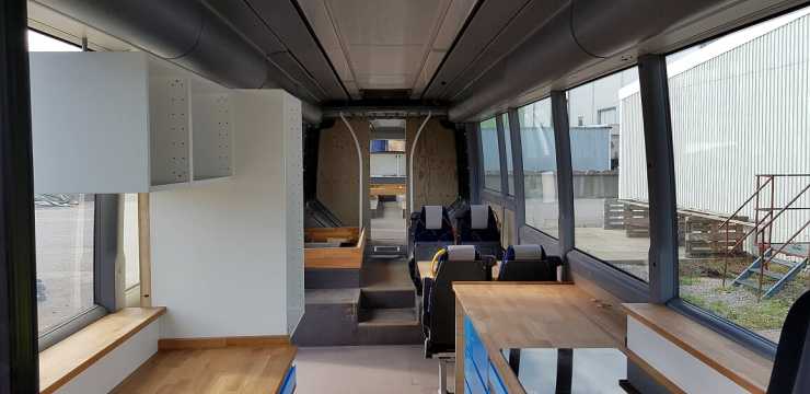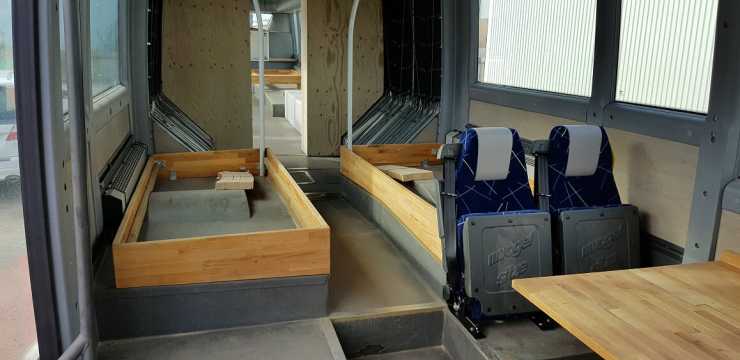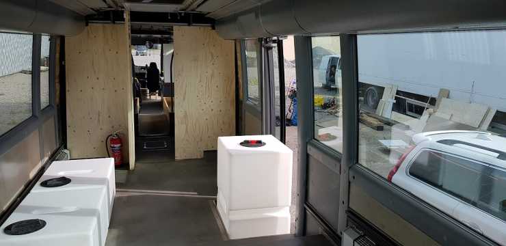 De ursprungliga elementen behölls, om än rensade från tuggummi. Med det sparades en hel del arbete, värmesystemet i en buss är väl tilltaget men till skillnad från en buss i linjetrafik öppnas dörrarna i husbussen betydligt mer sparsamt.