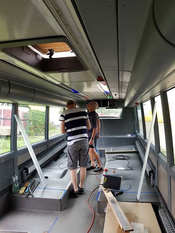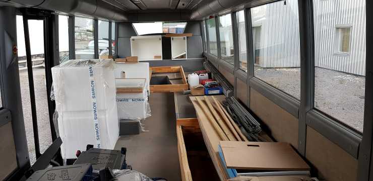 Bussen hittade de på Blocket redan 2018 och nu har det blivit dags att sätta igång projektet att ändra den till en modern husbil, om man nu inte ska kalla det för en liner även om linerns lösningar inte stod som förebild. När den levererades var Robert och Billie inte ens i Sverige, de hade fastnat i Tyskland men Roberts far tog emot den och satte genast igång med det basala, att riva ut den inredning som inte skulle vara kvar.