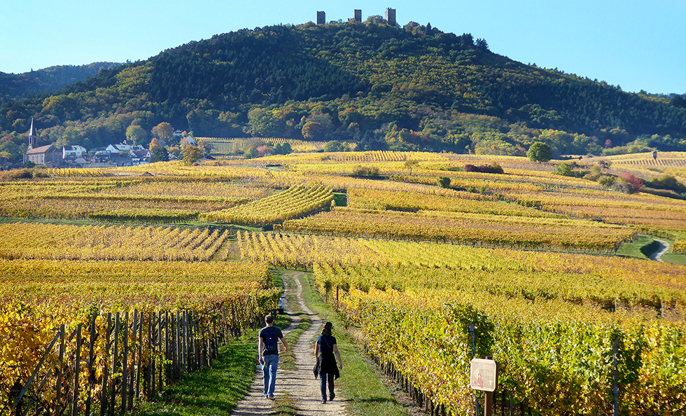 Vinfälten sträcker sig upp mot bergen där det tycks ligga en gammal borg på varje topp. Det finns många vandringsleder och det är oftast inte långt till nästa by.