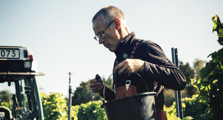 Ingvar Svensson skördar druvor på Ästad Vingård.