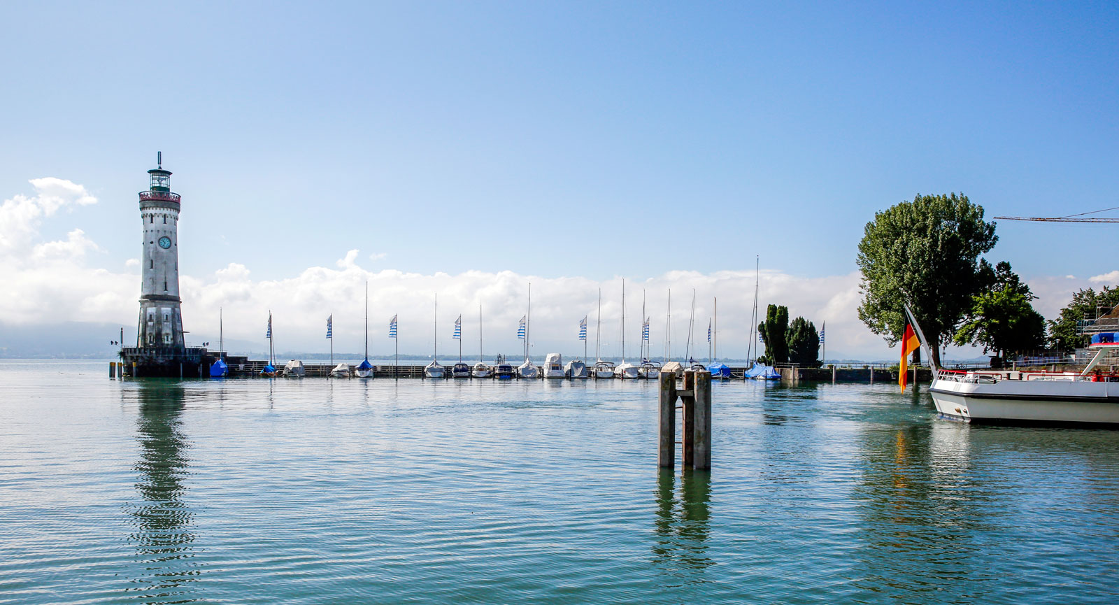 Hamnen i Lindau. Längst ut står den nya fyren, 33 meter hög.