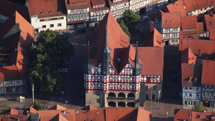 Här hittar vi ett av Tysklands äldsta och vackraste rådhus även om det från början byggdes som ett köpmanshus och de var alltid extra påkostade. Med en fantastisk röd fasad på en sandstensgrund toppas den av sina tre svarta torn och särskiljer sig ifrån den övriga stadens fina korsvirkeshus. Grunden lär ha lagts redan 1302 och byggandet kom att pågå i flera hundra år, inte förrän 1674 stod den klar i det skick vi nu kan beundra och utsikten över den gamla staden är bedårande.