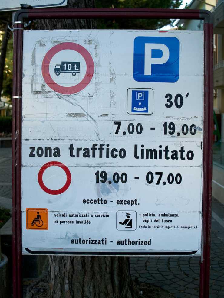 Zona Traffico Limitato, italiensk miljözon där det krävs betalning för att få köra. Dessutom kan skyltarna vara så här svårtydda och reglerna skiljer sig därutöver mellan olika städer.
