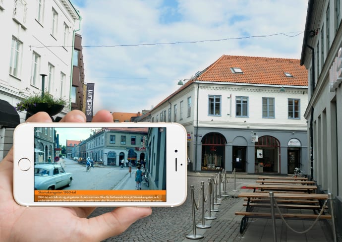 Med hjälp av historiskt bildmaterial har apputvecklaren Be Here Then AB i samarbete med Lunds stadsarkiv och Lund Tourist Center skapat en digital stadsvandring genom Lund med bilder från förr som kombineras med vyer från idag.