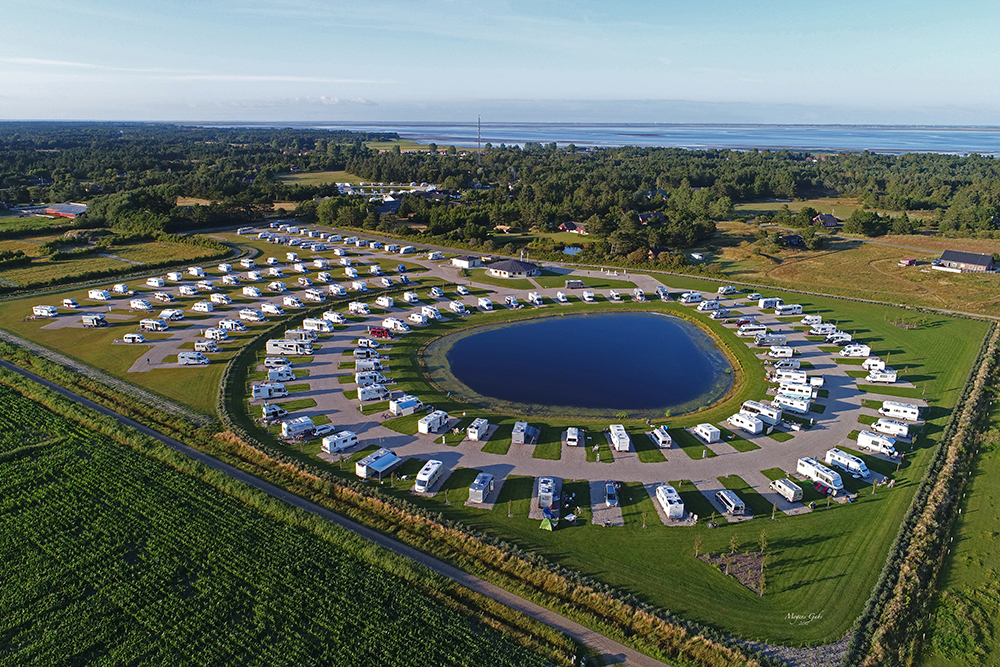 En anlagd damm med bilarna på grusunderlag i en cirkel runt omkring och gräs mellan platserna. Allt placerat på en ö, Rømø, Danmarks sydligaste ö i Nordsjön bara tre kilometer norr om den mer namnkunniga tyska ön Sylt. Rømø förbinds dessutom med fastlandet genom en nio kilometer lång väg på en bank som på fastlandet utgår ifrån Skærbæk. Långt ifrån de vanliga ställplatsernas rader av bilar på en platt yta på fastlandet utan någon speciell charm. Dessutom med cykelavstånd till havet och orter med restauranger om områdets bageri, butik och krog inte räcker för dina behov. I omgivningen finns Nordeuropas bredaste sandstrand i Lakolk och Sønderstrand. Visst passar namnet Oasen extra bra på en plats som denna?