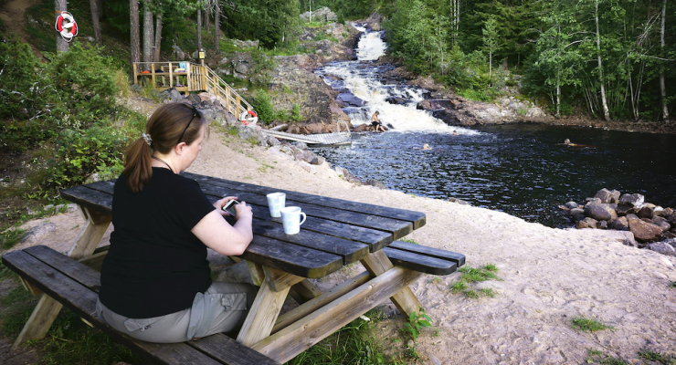 Tänk jacuzzi förstora den hundra gånger och placera ut den i skogen. Då har du Femtfallets hölja i norra Värmland. En sällsynt bubblande badplats.