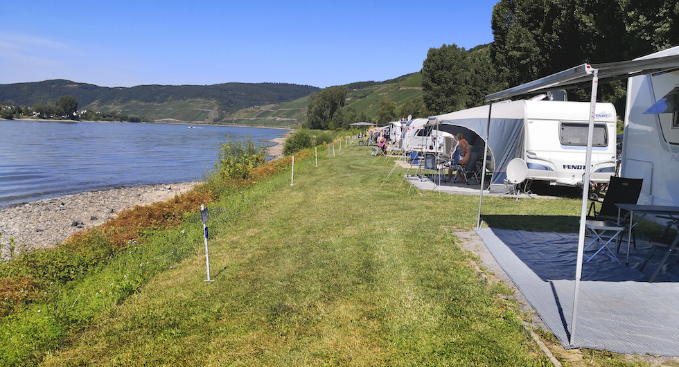 Att campa vid Rhens strand är en upplevelse med tanke på all fartygstrafik. Camping Sonneneck är kilometerlång och de flesta platser har flodutsikt.