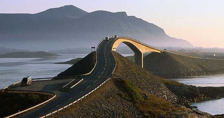 Vi kör med spänning ut på den mäktiga Storseisundbrons hisnande, svängda valvbåge. De sammanlagt sju broarna, som tog sex år att bygga, kommer under drygt åtta km att ta oss förbi kobbar och skär mellan Kårvåg på Averøy och Vevang i Eida och de gör det på ett sätt du aldrig kommer att glömma! Att Atlanterhavsveien är utnämnd till nationell turistväg tack vare vägens banbrytande arkitektur samt den fantastiska kustlinjen längs vägen förvånar få.