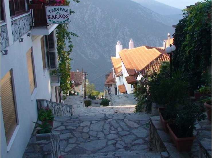 Vi är i ett betagande vackert och världsarvsklassat landskap som bakom pinjeträd och blommor blickar ända ner till Korintiska vikens blå vatten vid hamnen i Itea. Rakt nedanför i ett kraftigt stup breder det fantastiska Phaidriades ut sig. Ovanför syns det 2500 meter höga berget Parnassos som reser sig över Delphi i ett ståtligt bergsmassiv, och dagens samhälle klättrar efter bergssidan med en utsikt som slår det mesta. På gångavstånd ligger de historiska platsernas imponerande ruiner och den åt muserna helgade källan Kastalia och floden Pleistos och lapar sol men oraklet är sedan länge borta. En kvarts bilresa bort ligger havet och en halvtimme iväg skidorterna. Jag sitter på en Grekisk bar och har bara ett litet räcke som skydd mot att störta 500 meter ner och njuter av en grekisk sallad och de ljumma vindarna. Och jo, utsikten gör att jag inte direkt har någon brådska med måltiden. Det är lätt att förstå att grekerna ansåg platsen helig.