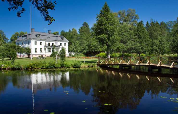 Väg 272 slingrar sig mjukt och vi kommer söderifrån fram till sjöarna där vi omsluts av vatten. Björkarna speglar sig i vattnet och vi njuter av den ovanliga miljön, det är bara på några få platsen i Sverige som man åker "genom" en sjö, annars är det brosystem som inte alls ger samma känsla. Strax efter vi passerat denna vackra väg når vi Högbo bruk som ligger som en pärla i denna speciella miljö.
