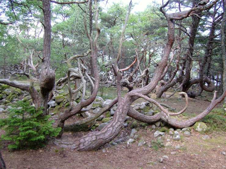 Vi möts av krokiga tallar och trolsk stämning i en natur som har pinats av havets vindar. Var som helst skulle trollen kunna komma fram i en skog som inte finns någon annanstans.