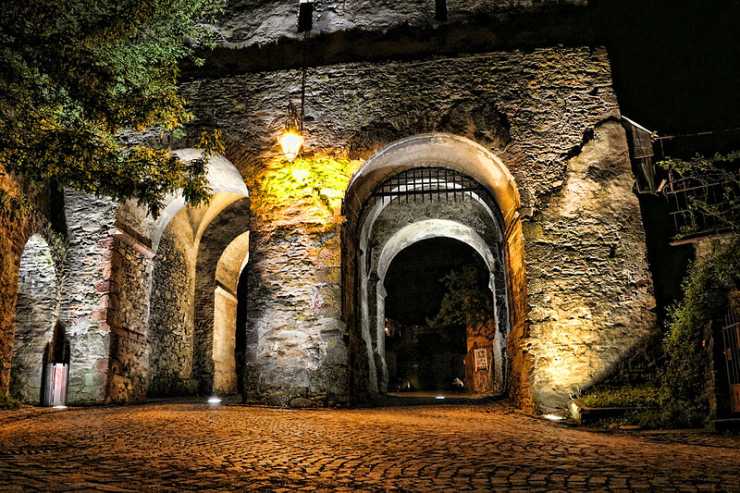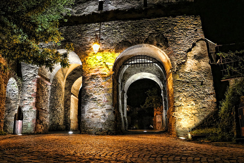 Den pergolaliknande smala stensatta gångvägen leder upp till stadsporten. Gradvis har utsikten över den moderna stadens tak blivit allt mer imponerande och det är med vördnad man träder in.