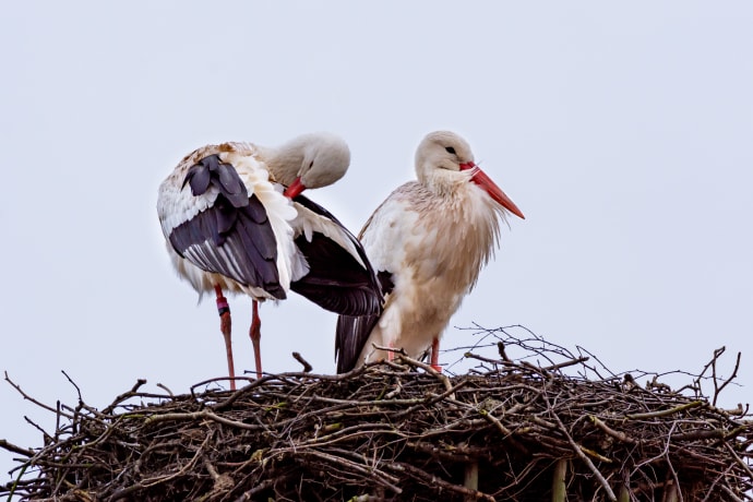 Ett säkert vårtecken i Skånes Djurpark är när det inneboende storkparet återvänder till sitt bo på ladugårdens tak. Storkar lever i livslånga par och hjälps åt med både bobygge och omhändertagandet av storkungarna. Just nu småpratar parkens storkar med varandra genom att klappra med näbbarna och förbereder sig för fullt inför äggens ankomst. Tillsammans hjälps de åt att bygga till boet så att det ska vara klart runt slutet av mars när äggen förväntas läggas.
