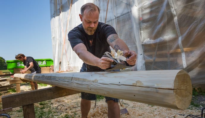 – Vi använder samma material som det ursprungliga, med dubbelspontade plankväggar, stockpanel och stråtak, men den det är också en avvägning och balansgång av vad som är rimligt utifrån funktion och dagens regelverk, säger Peter Ivarsson, bebyggelseantikvarie och vikarierande fastighetschef på Tjolöholm.