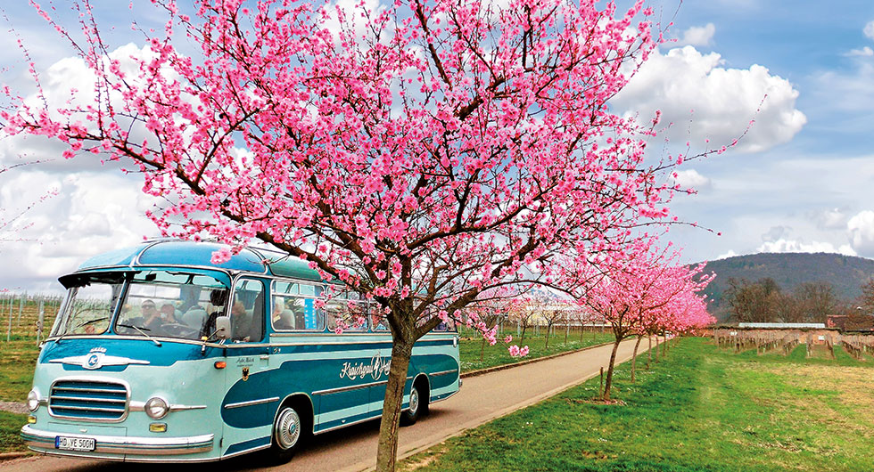 En veteranbuss med panoramafönster (Setra från 1960) skjutsar besökare till de vackraste platserna i Pfalz under mandelblomningen.
