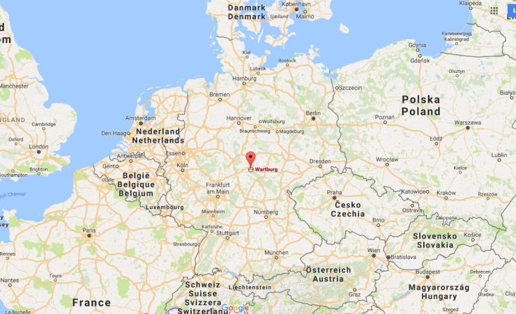 Wartburg ligger i orten Eisenach, i stort sett mitt i Tyskland strax öster om den forna järnridån. GPS: 50°58'02.7"N 10°18'22.8"E