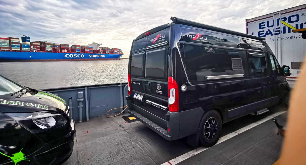 Nästan varje gång vi har rest genom Tyskland har vi passerat öster om Hamburg. Efter att ha studerat kartan lite extra insåg vi att det går en färja över Elbe väster om Hamburg. Förutom en ny resväg fick vi också se ett av världens största fartyg på nära håll.