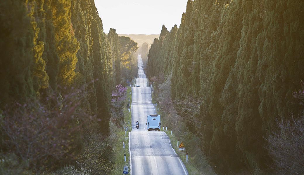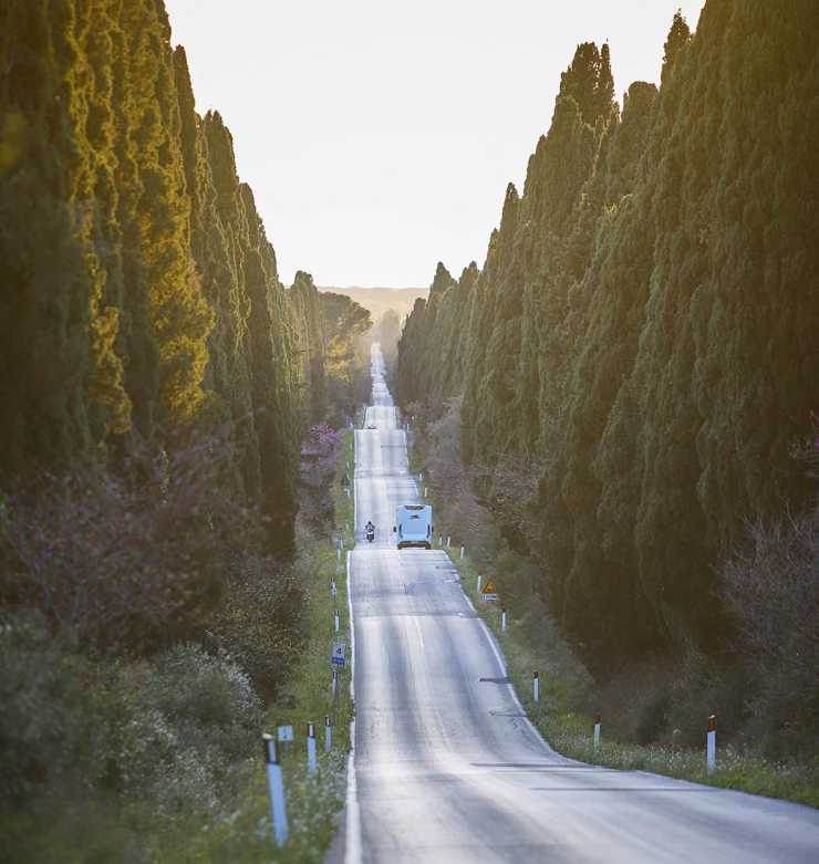 På väg från Bolgheri bestämmer vi oss för att plåta Laika Kreos L 5009 på den fina raksträckan. Precis som så ofta går det inte riktigt som vi tänkt oss. Mats som är den enda av oss med C-körkort tar husbilen, vänder och återvänder sakta mot mig, som väntar mitt i vägen med gigantiskt teleobjektiv på kameran. Självklart dyker två bilar upp på den annars så öde vägen, precis när vi ska plåta. Och när vi gör om allt har ett gäng unga italienare dykt upp från ingenstans och går mitt på vägen.