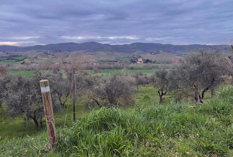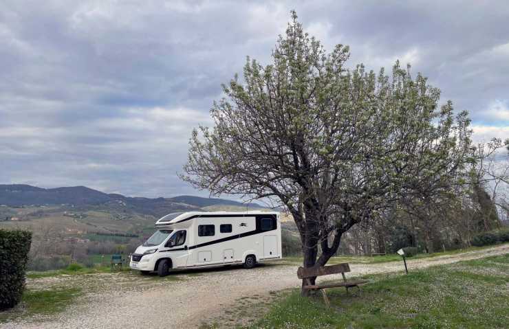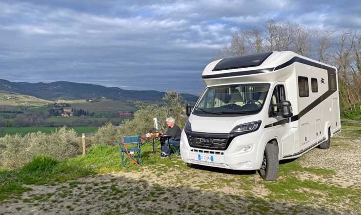 Ställplats med utsikt över olivlundar på de toskanska kullarna.