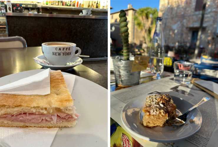 Maten i Italien lever upp till förväntningarna. Den varma mackan med tjocka lager kokt skinka och nötkakan är supergoda.