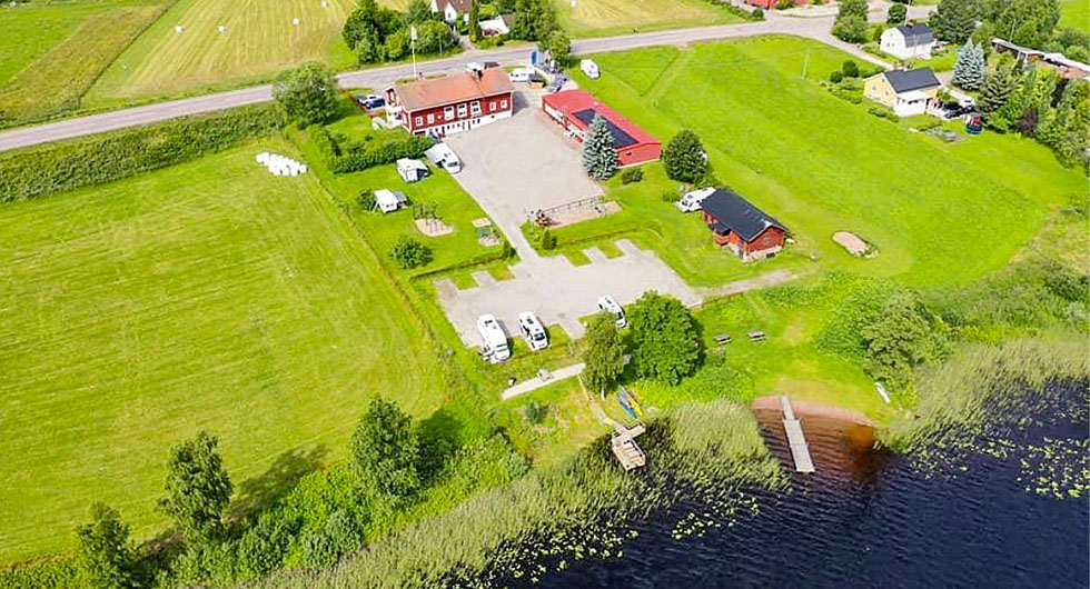 För samma pris som för en tvårummare strax utanför Stockholm får man, förutom ställplatserna, ett boningshus med två lägenheter i en gammal skolbyggnad från 1800-talet, en länga som fungerar som servicehus där det också finns uthyrningsrum och en receptionsyta med café.