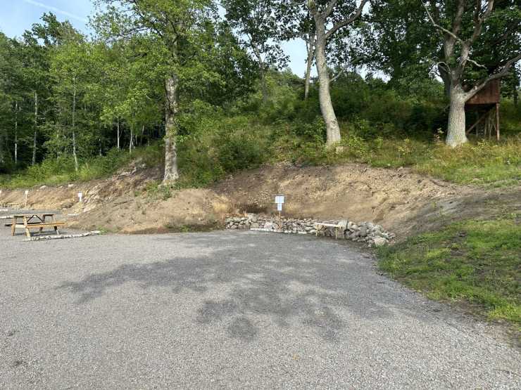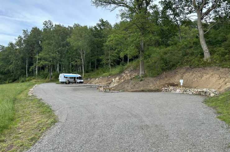 Det är gården Länsmansgården i Uppgränna som anordnat fyra ställplatser på grus i en backe mellan skogen och sjön. Samtliga ställplatser är tydligt utmärkta med björkstammar och är trevligt inramade av stenmurar och små bänkar. Det finns ingen el, men färskvatten och som sagt vacker utsikt. Taxan är 150 kronor och betalas med Swish eller kontant i en låda.