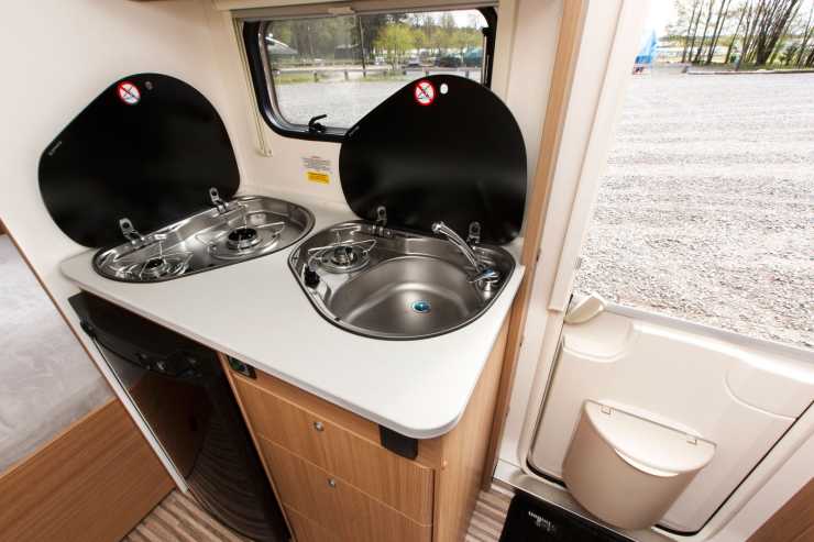 Gasolfacket är snyggt integrerat i karossen och i det finns plats för två gasolflaskor modell P11. Här hittar vi även en burk punkteringsspray, stödbensvev, plats för gråvattenlunga eller gråvattentank samt plats för stödbensklossar och annat icke ömtåligt. På vagnens vänstra sida sitter elanslutning samt vattenpåfyllning. Något vi saknar är möjligheten att lasta in saker utifrån utan att för den delen bära dem genom dörren. Det skulle vara bra om det fanns en utvändig lucka till förvaringsutrymmet under sängen för exempelvis campingmöbler. Entrédörren är en delad så kallad stalldörr med myggnät på den övre delen. Innanför entrén finns inga hängare eller krokar för kläder. Direkt till höger vid dörren sitter köksmodulen vilken har två täcklock. Under det ena finns diskhon med en uppfällbar kran samt en plåtskiva som döljer en av vagnens tre gasolplattor. Smart! Det innebär att de andra två gasollågorna finns under det andra täcklocket. Allt från Dometic. Arbetsytorna får med beröm godkänt i en så pass liten vagn. Köksfläkt finns inte men väl ett öppningsbart köksfönster samt entrédörren intill för vädring. Förvaringen i köksmodulen består av två utdragslådor samt en lucka i botten som rymmer lite småsaker trots att hjulhuset delar utrymmet. En nackdel med de två överskåpen är att de varken har mellanvägg eller hyllplan. Entrédörren har en integrerad hållare för soppåse. Kylskåpet är även det från Dometic och rymmer 80 liter inklusive ett urtagbart frysfack.